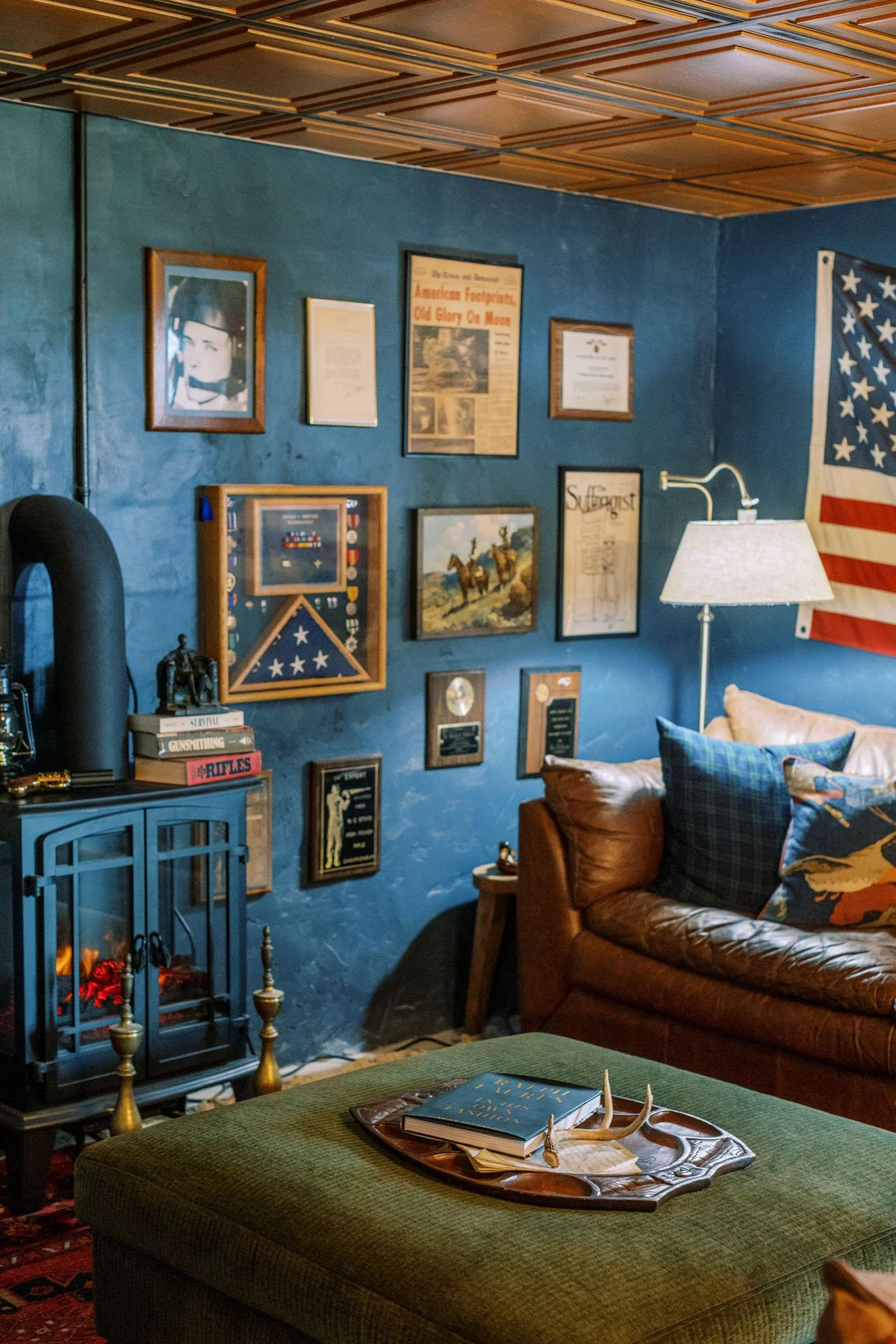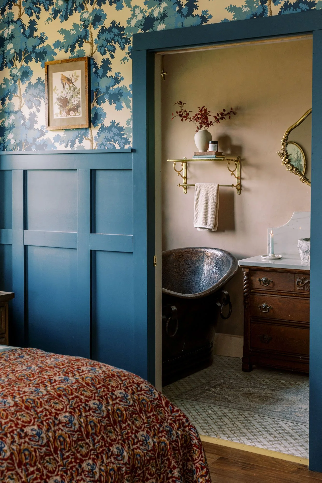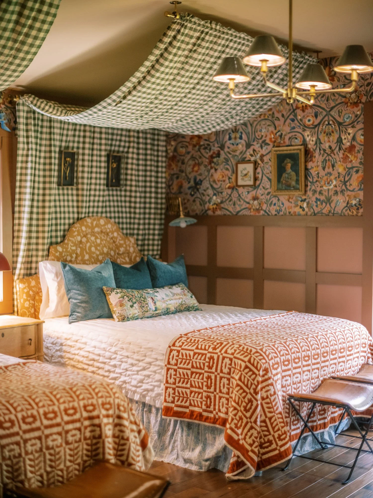 “I always like to honor the location when I’m designing my personal home,” explains Vaile, who adds that their Raleigh home boasts high ceilings and “lots of color.” But with this mountain home, there’s so much color and nature outside that I knew it needed darker jewel tones. It just felt like the right thing.” Leaning into heavy pattern and a warm, dark color palette, Vaile drew inspiration from her travels, as well, installing the very same Sandberg wallpaper she saw in the Highlander Mountain House’s guest room into her owner’s bedroom. “Some things just stick in your head, and that wallpaper was one of them,” she says. “It inspired the rest of the home’s design.”