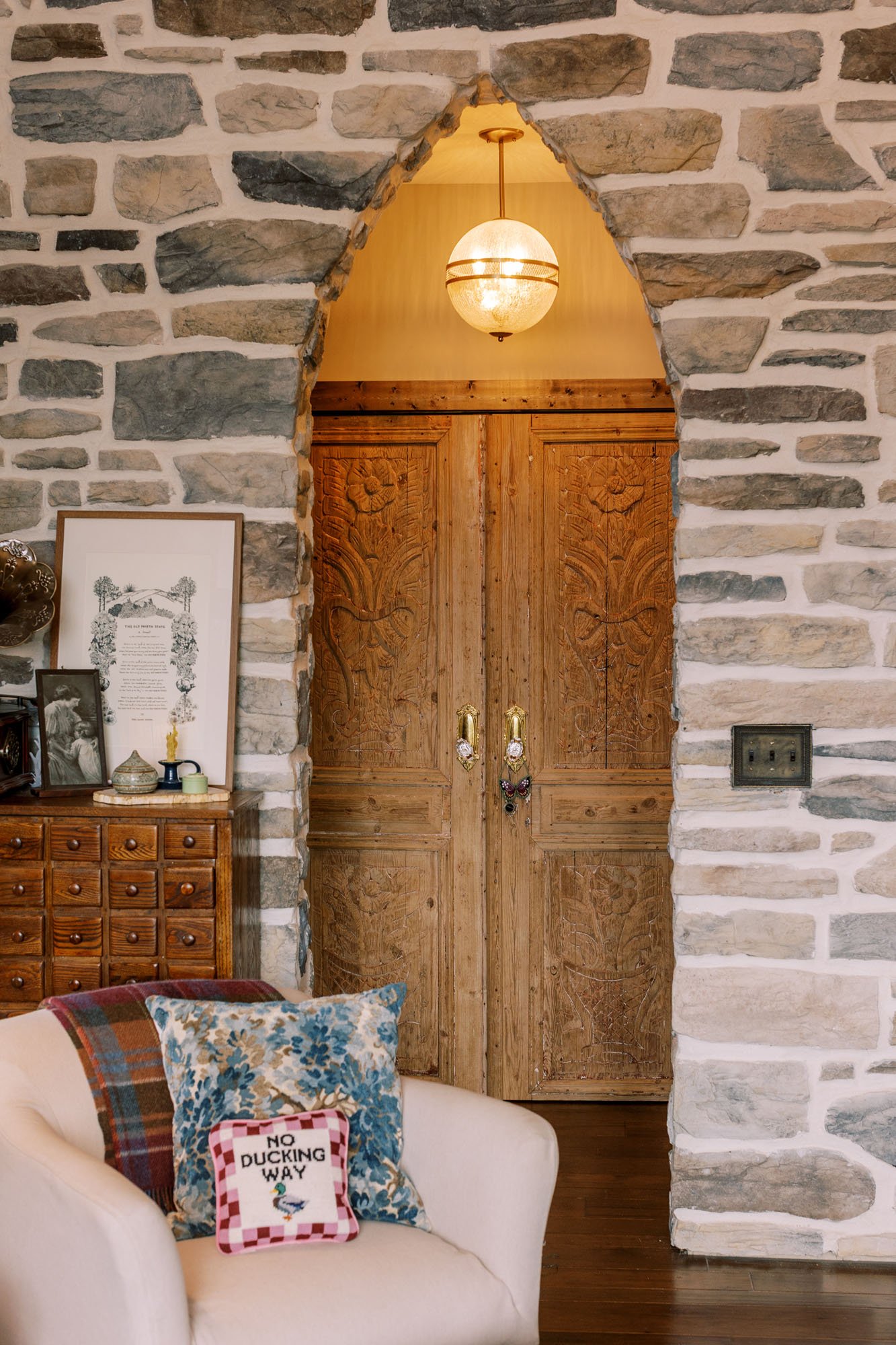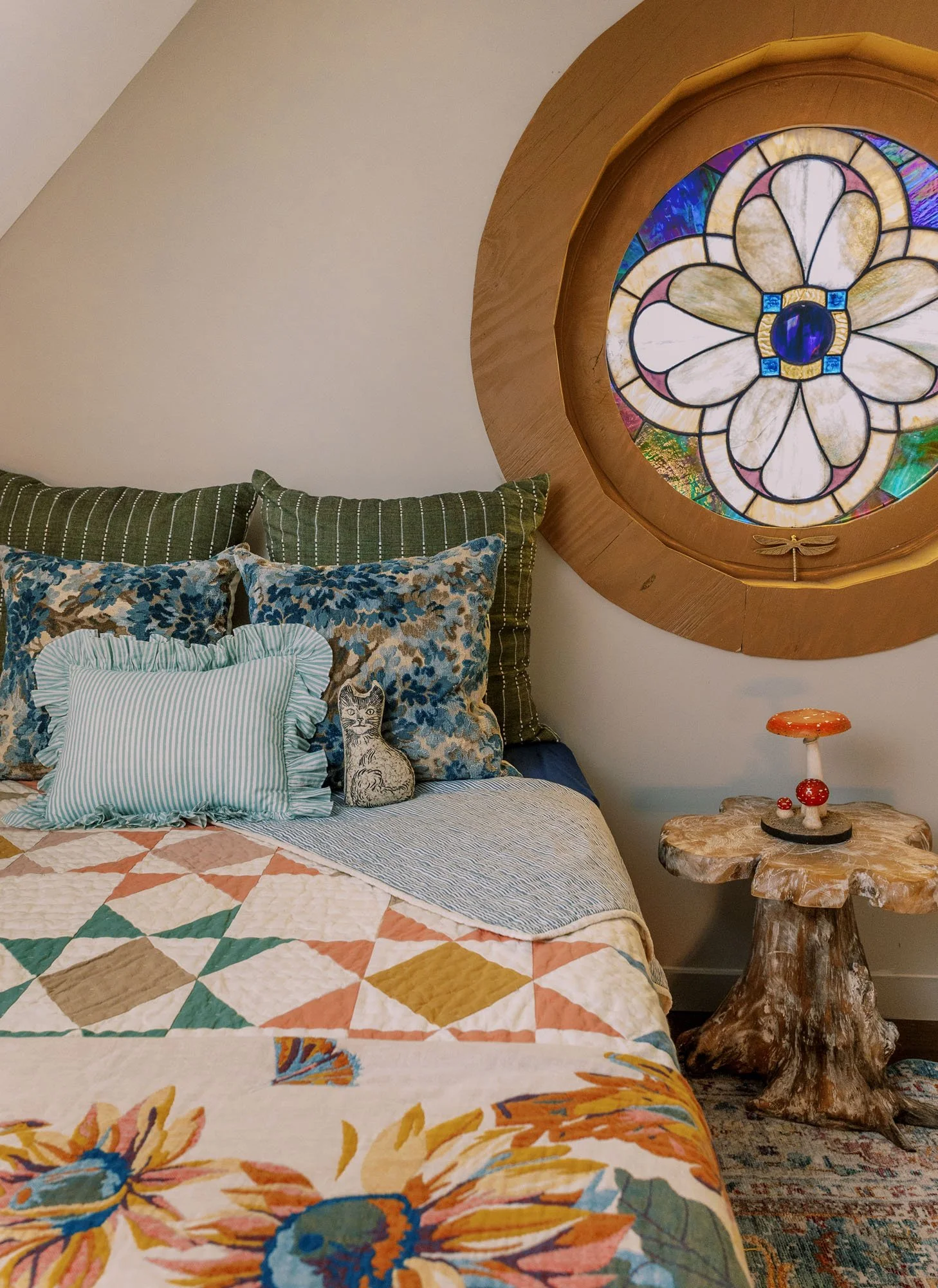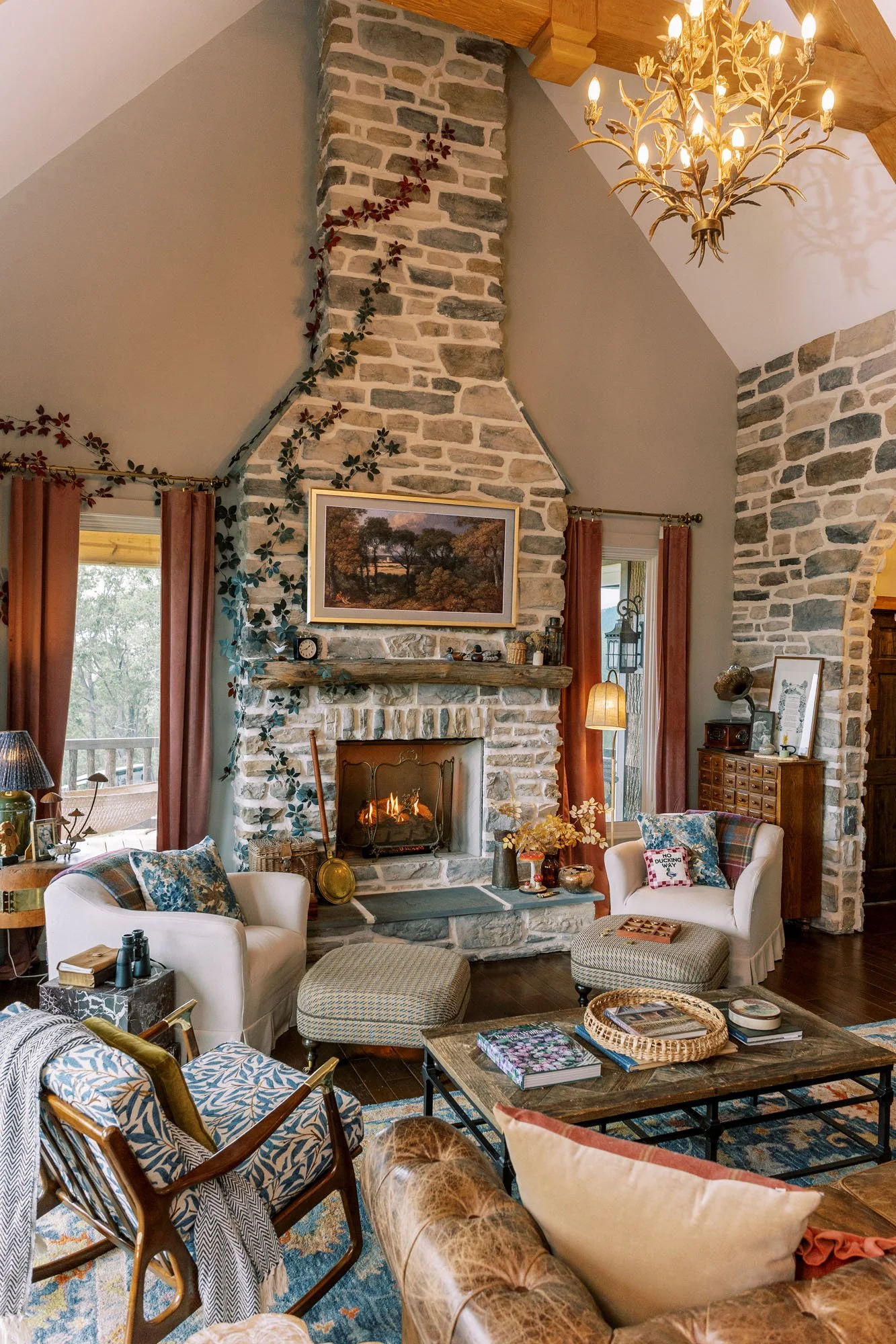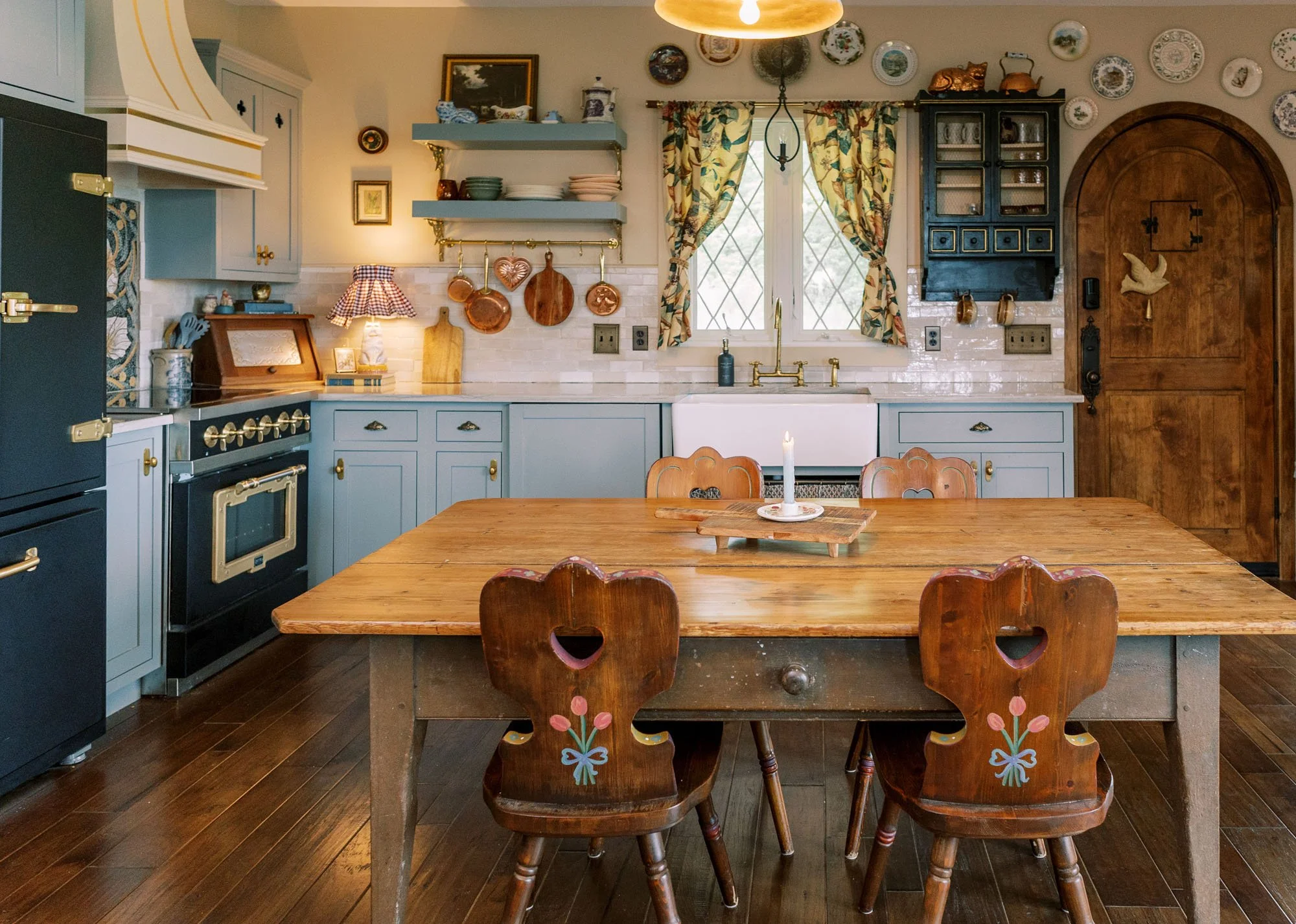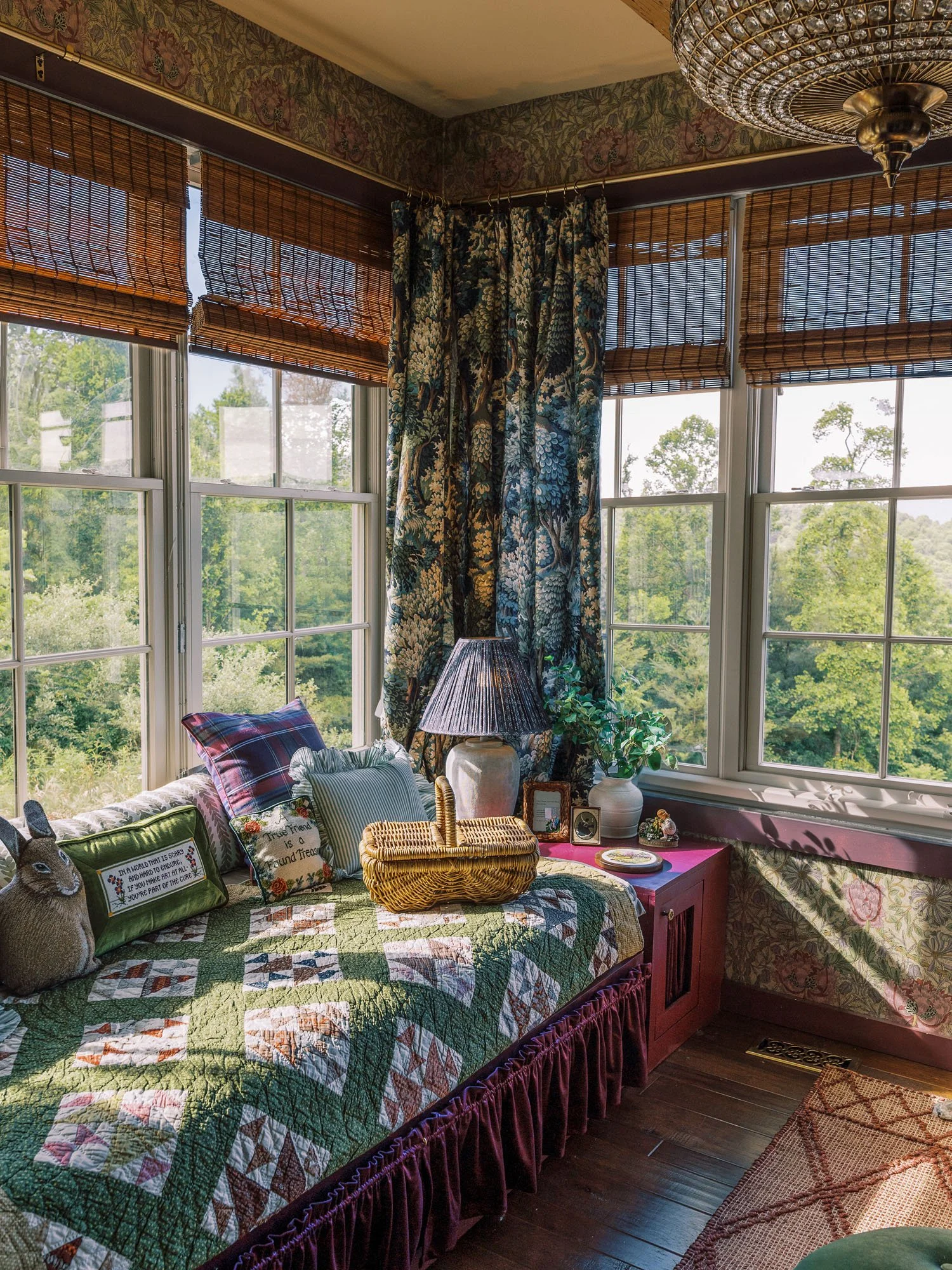 Brimming with vintage treasures, layered patterns, and vibrant color, Vaile leaned into the delightfully eccentric to create a home that feels unmistakably warm. Antique doors from The Bank in Louisiana open to a charming pantry, while the sunroom, bathed in natural light and adorned with William Morris wallpaper, cradles a two-century-old quilt, offering a soft and inviting place to linger. Much of the pieces Vaile sourced were from The Find Vintage Warehouse of Burnsville, which washed away during Helene but recently reopened.